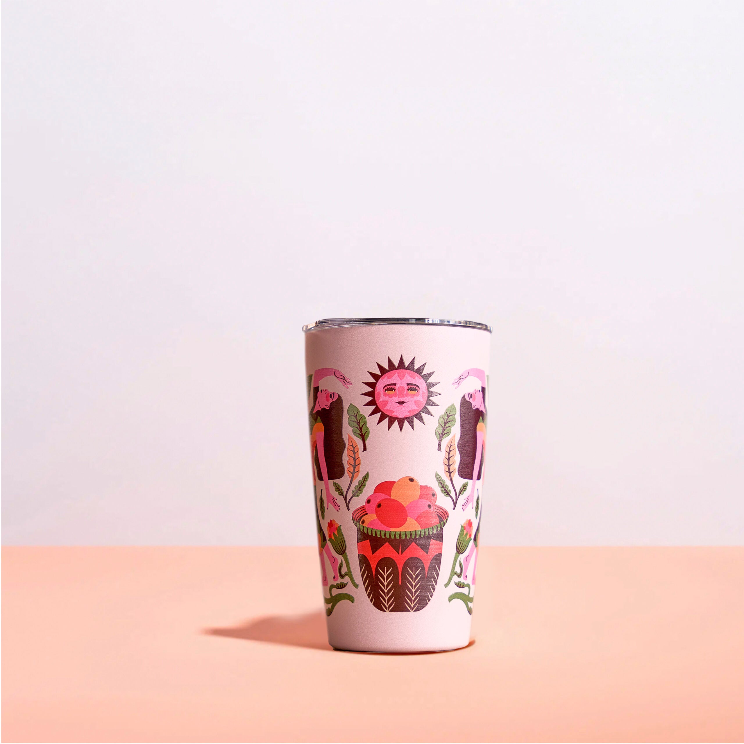 Our Village travel tumbler is wrapped with the stunning artwork designed for The Village women-produced coffee by Costa Rica-based illustrator Erica Zeledón Salazar. The perfect sidekick for any outing with your coffee in tow, this 12 oz. tumbler features a splash-proof press fit lid and thermal insulation which keeps your hot drinks hot, and your cold drinks cold.
